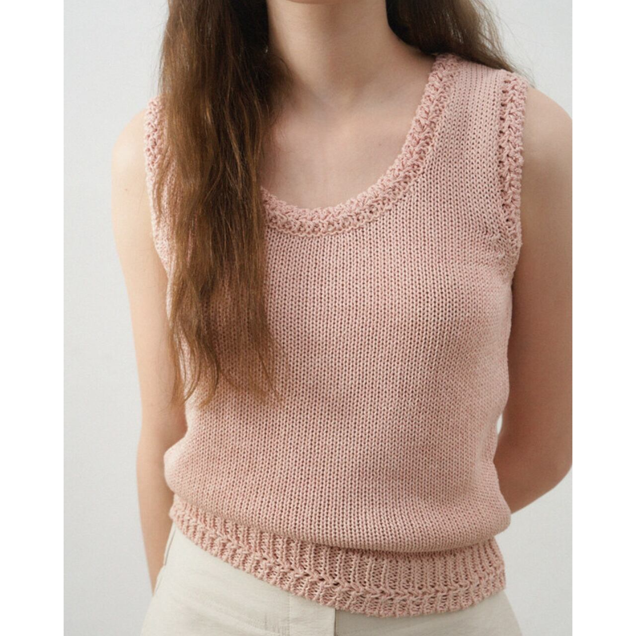 ハイゲージの編み地をアームホールとネックライン、裾に重ねたディティールがアクセントになった1着です。