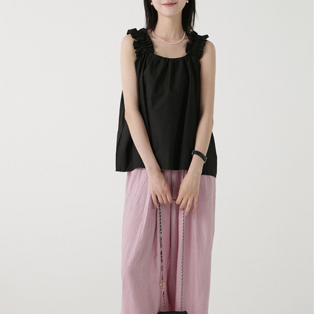 ショルダー部分のフリルが目を惹くノースリーブブラウス。