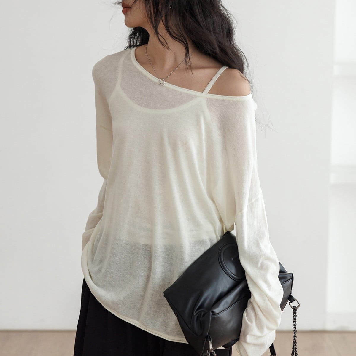 オーバーシルエットのシアーニットとキャミソールのセット。